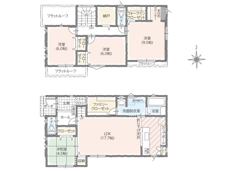 LDK17.7畳 1階 1室  和室4.5畳 1階 1室  洋室6畳 2階 2室  洋室9.5畳 2階 1室
