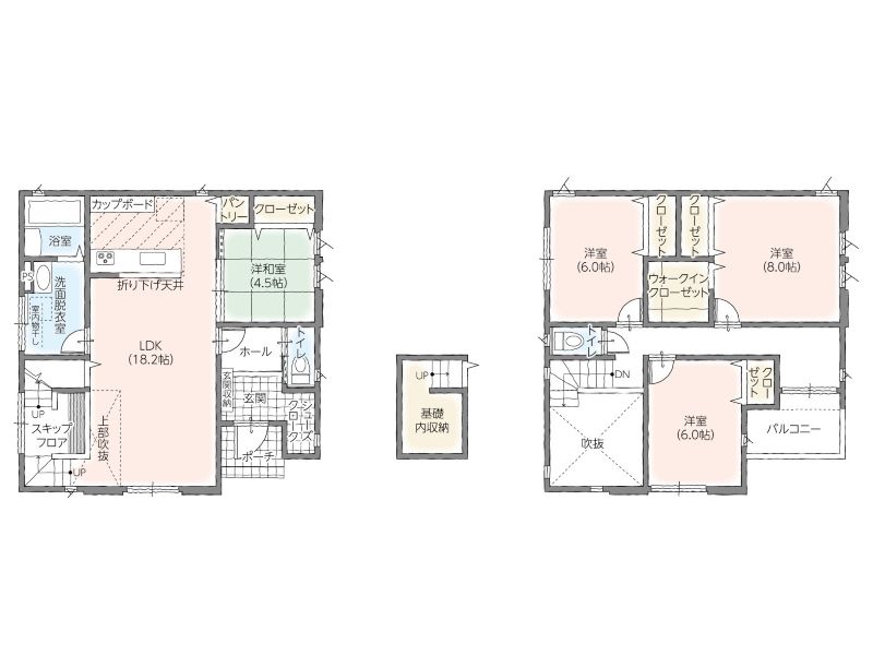 LDK18.2畳 1階 1室 和室4.5畳 1階 1室 洋室6畳 2階 2室 洋室8畳 2階 1室 |